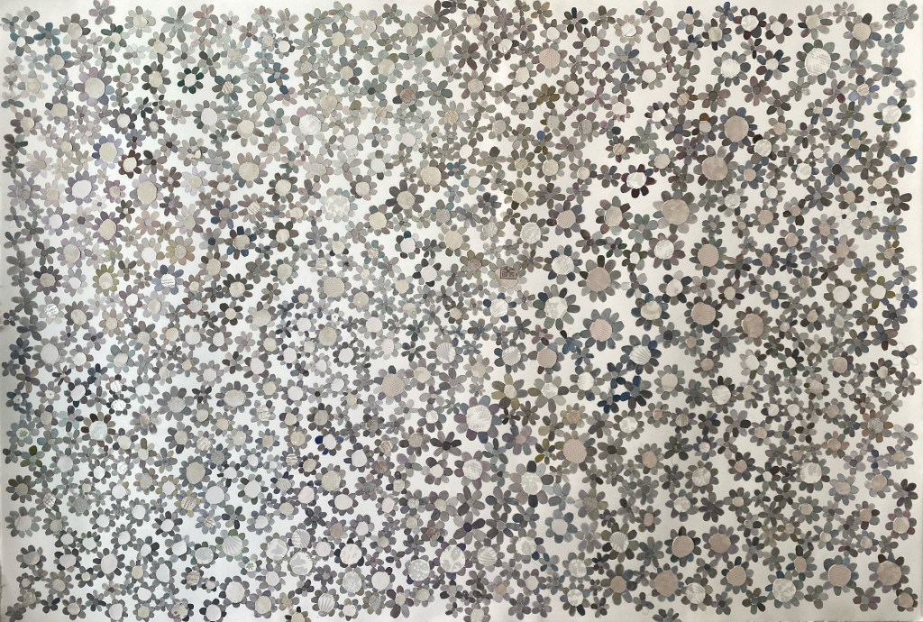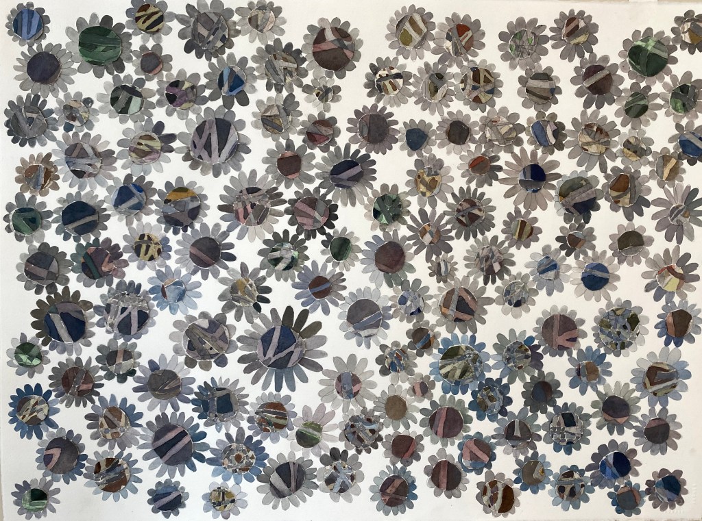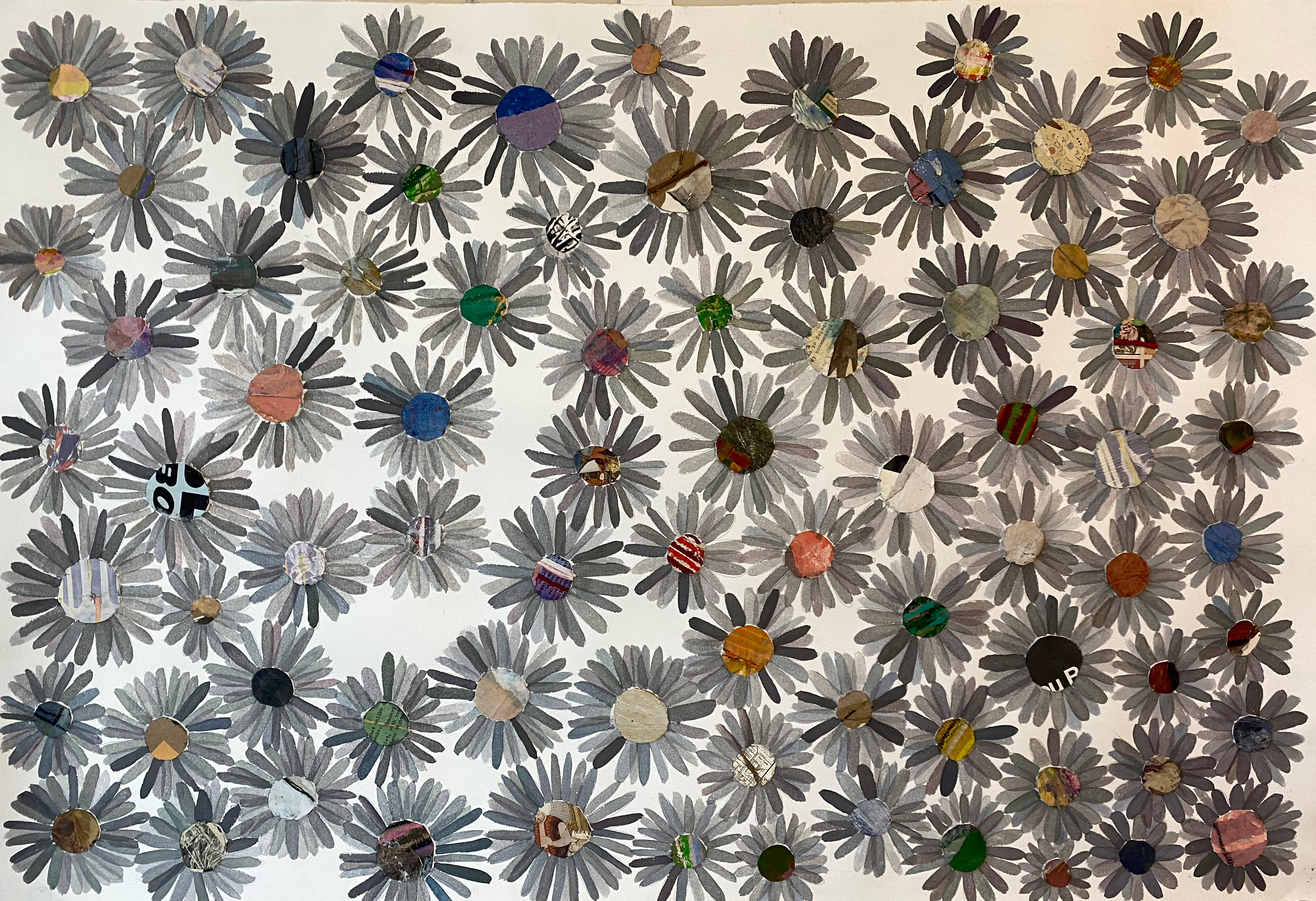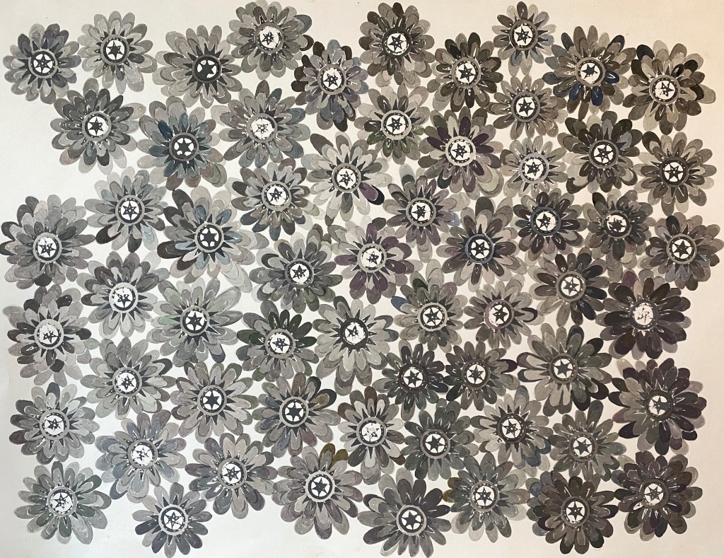 The aster family (Asteraceae) is one of the largest angiosperm families, with more than 1,620 genera and 23,600 species of herbaceous plants, shrubs, and trees distributed throughout the world. The plants are characterized by their composite flower heads and one-seeded achene fruits. This series of work takes the generic and symbolized shape we think of when we think of “flower” and plays with the idea of the natural and the manufactured as the flower shapes, in their chromatic greys can be seen as mechanical gear shapes. Thoughts of genetic hybridization of plants and industrialization of nature are considered in this work.