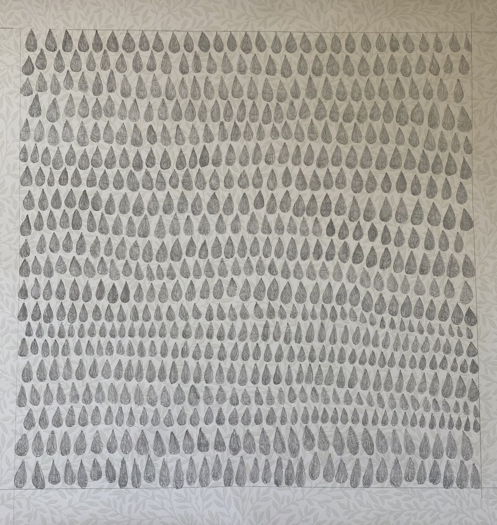 Serial Tears, 2023, graphite on wallpaper, 20 x 20″